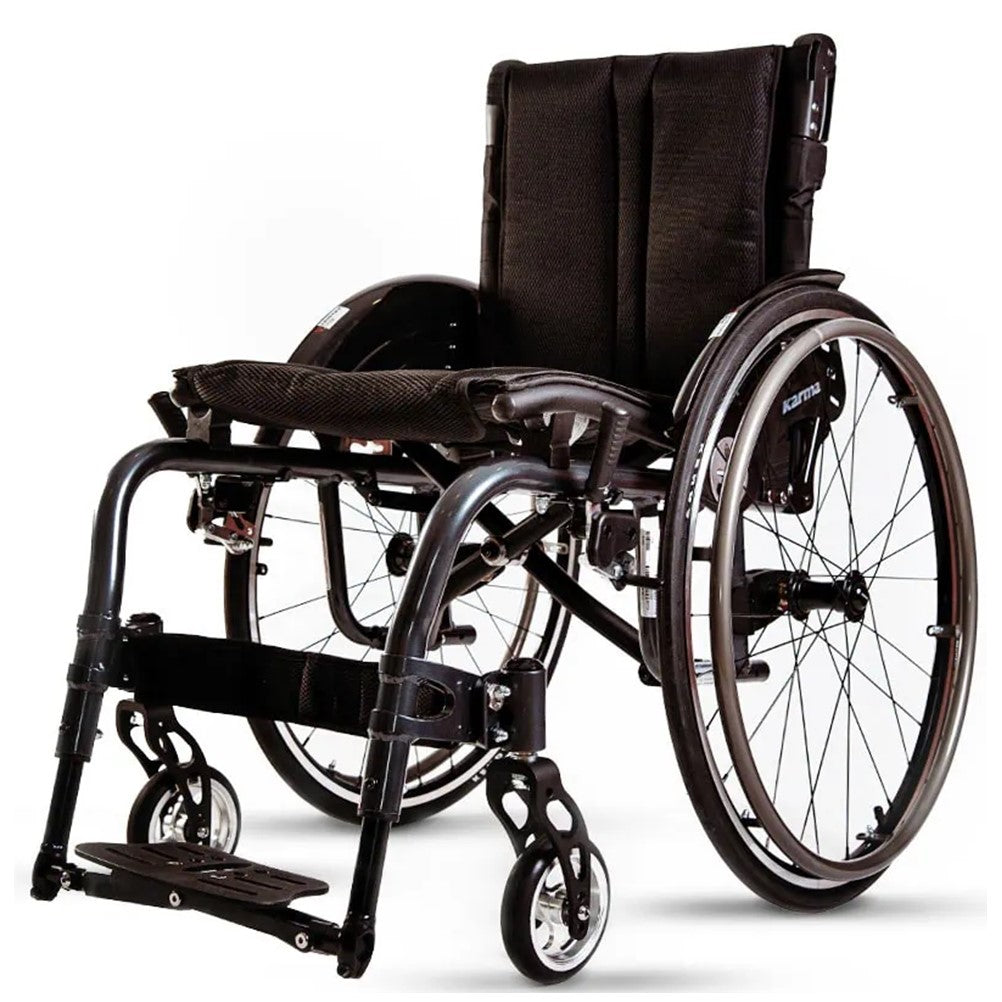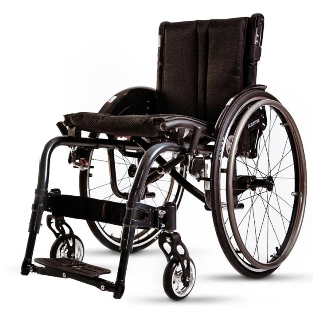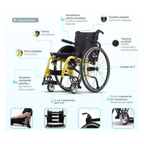 Silla de ruedas activa liviana en aluminio de marco plegable, que soporta peso de hasta 125 kg. Tapicería en lona acolchada,
